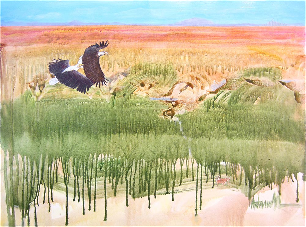 This newest series of paintings consists of a background setting of abstract design elements, with realism as a surprise focal point. Nature is a major theme, as it is in much of my work. After I’m satisfied with the overall expanse of the canvas, I paint realistic flora and fauna within the semi-abstract backdrop.